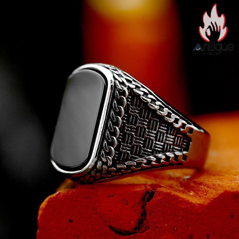 Antique Jewelry 幅広スクエアブラックオニキスファッションチタンリング 高級感 個性的レトロリング