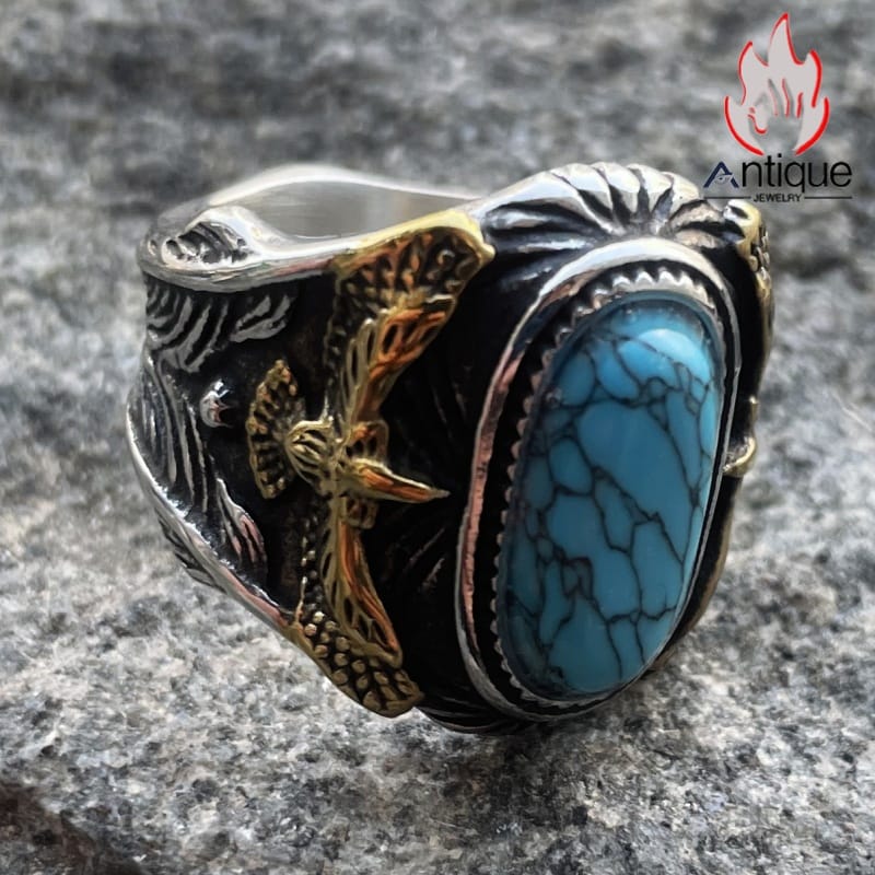 Antique Jewelry レトロパンク風 イーグル メンズリング 個性的 トルコ石装飾リング