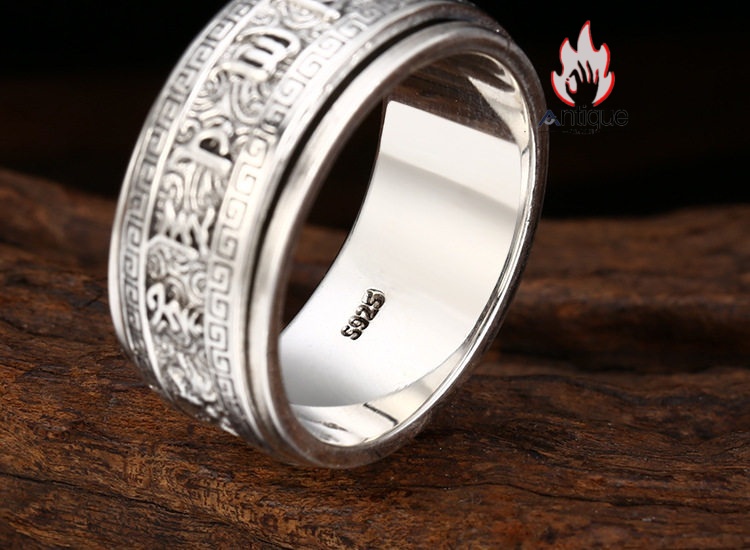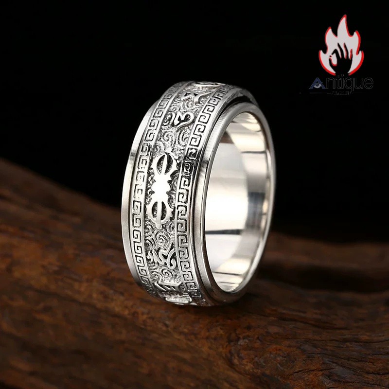 Antique Jewelry S925 シルバー 精巧な六字真言金剛杵リング 回転式降魔杵指輪 メンズ