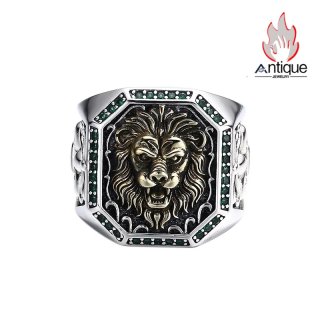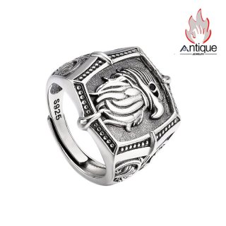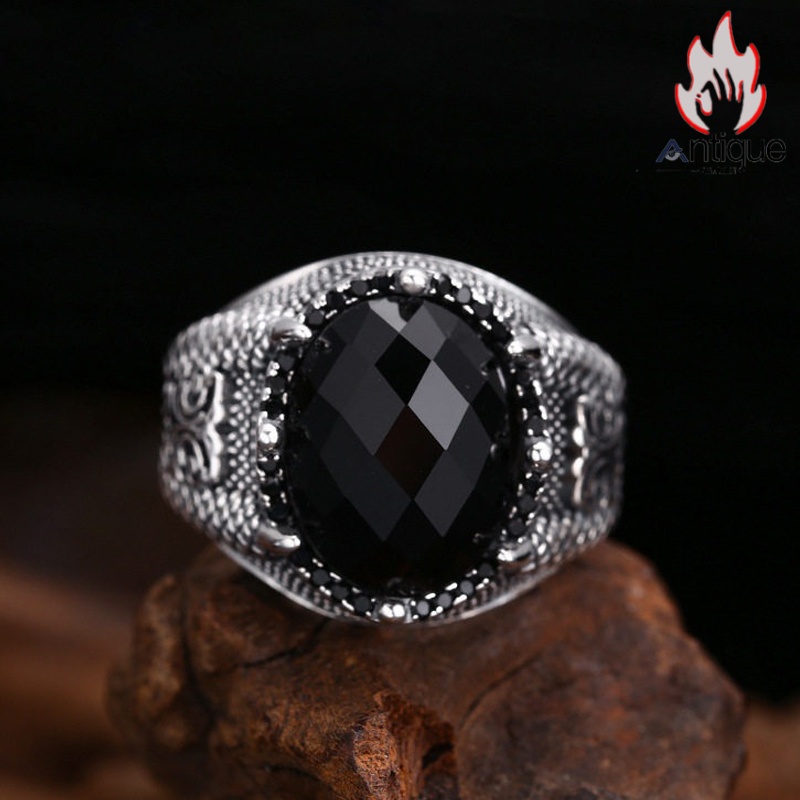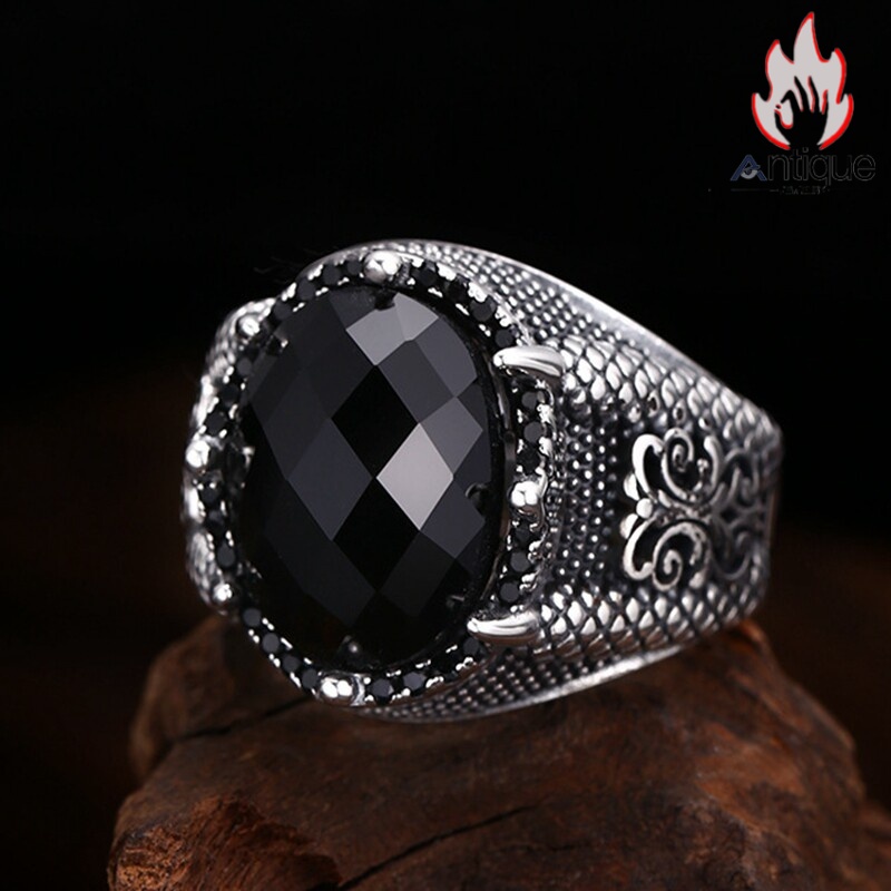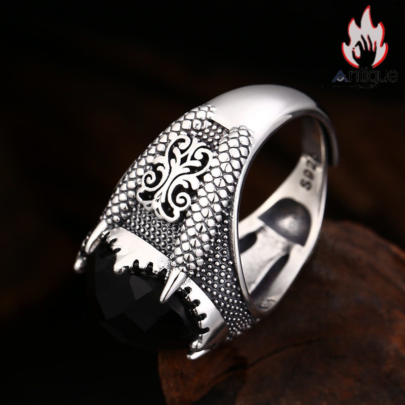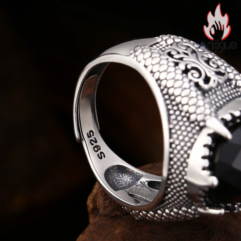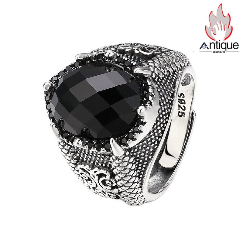 Antique Jewelry S925 純シルバー 龍鱗&龍爪彫刻 メンズ指輪 分厚い重厚感 多面カットブラックジルコニア レトロ ゴシックスタイル アクセサリー