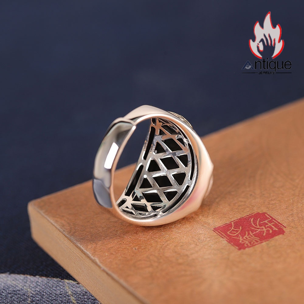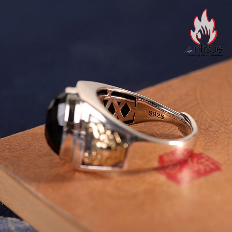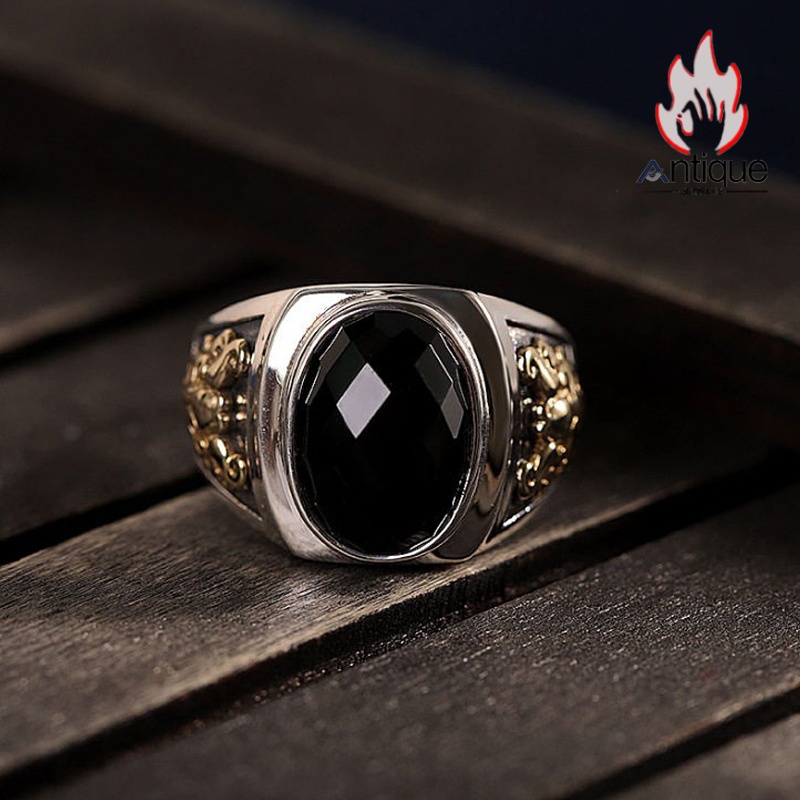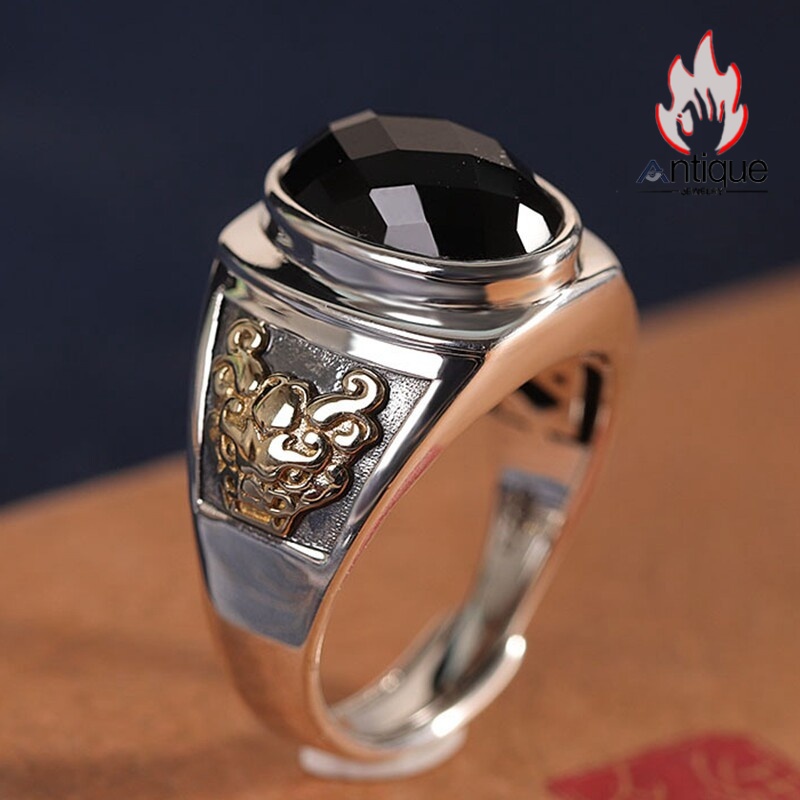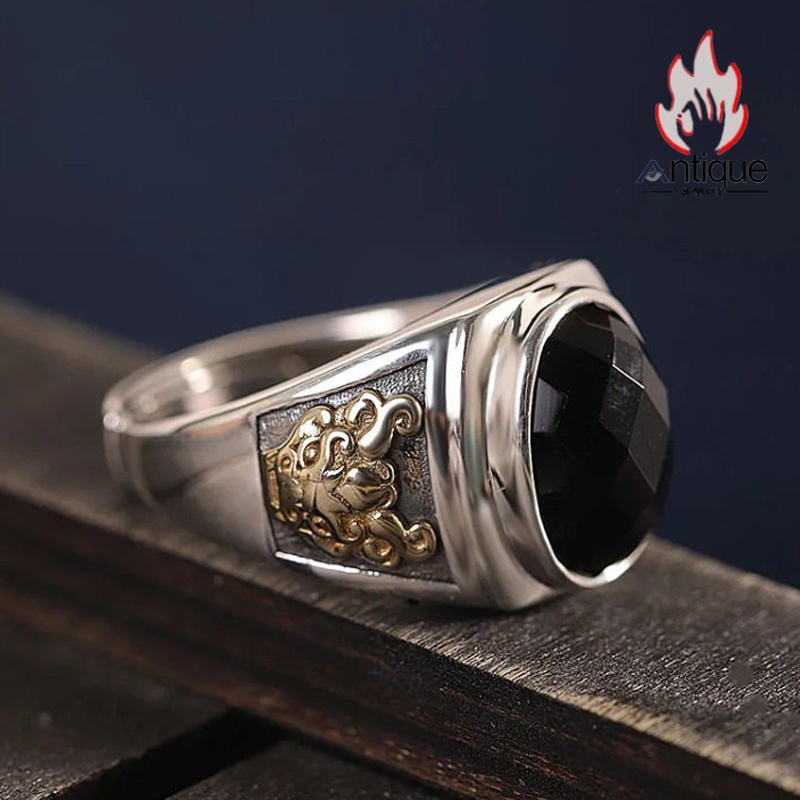 Antique Jewelry S925 シルバー製 ゴールドカラー貔貅モチーフ オニクス付きリング ヴィンテージゴシック