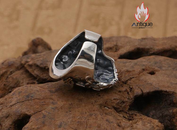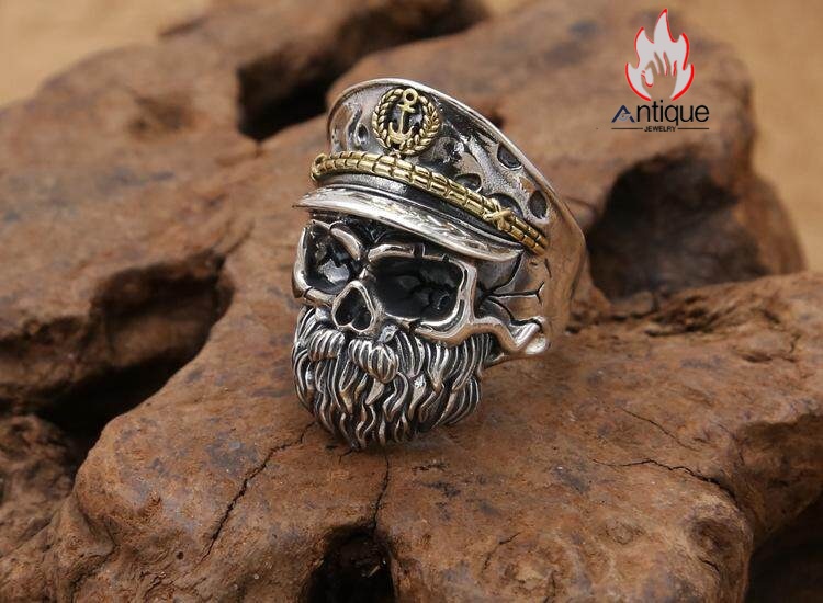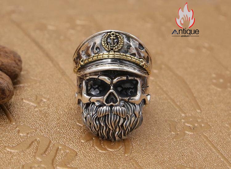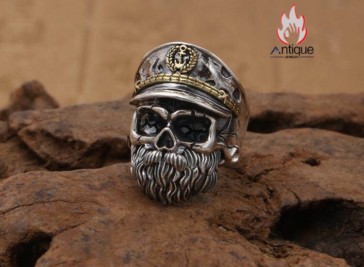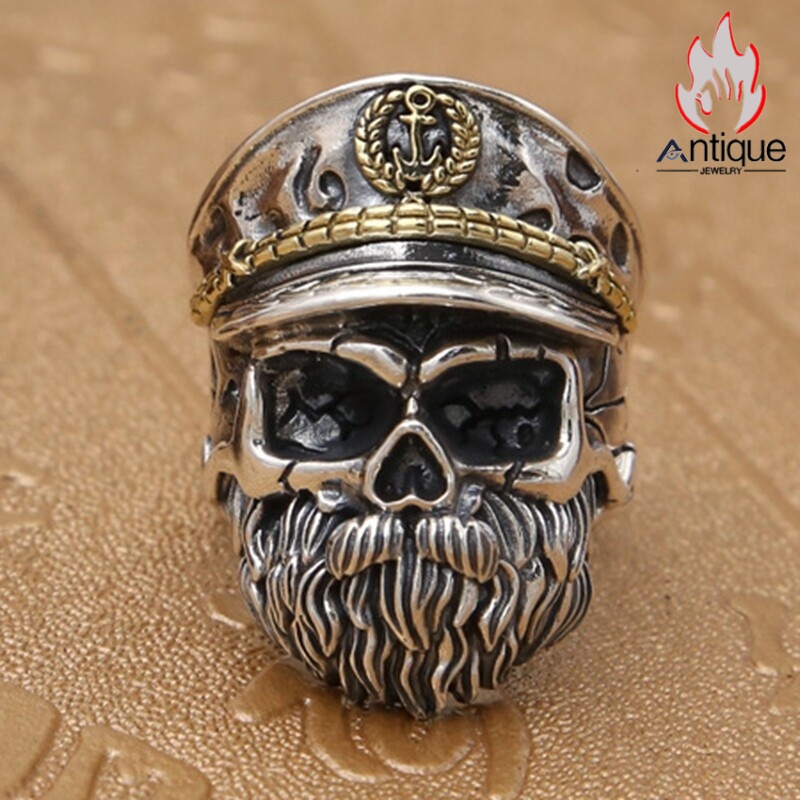 Antique Jewelry S925 シルバー スカルリング メンズ ゴシックスタイル ヴィンテージ加工 海賊船長 ドクロモチーフ 指輪 アクセサリー