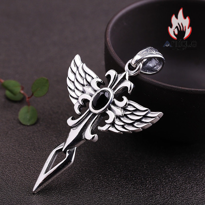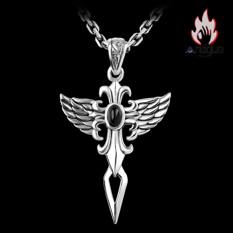 Antique Jewelry S925 シルバー製 守りの翼デザイン 天使の羽クロス オニクス装飾 男女兼用ペンダント