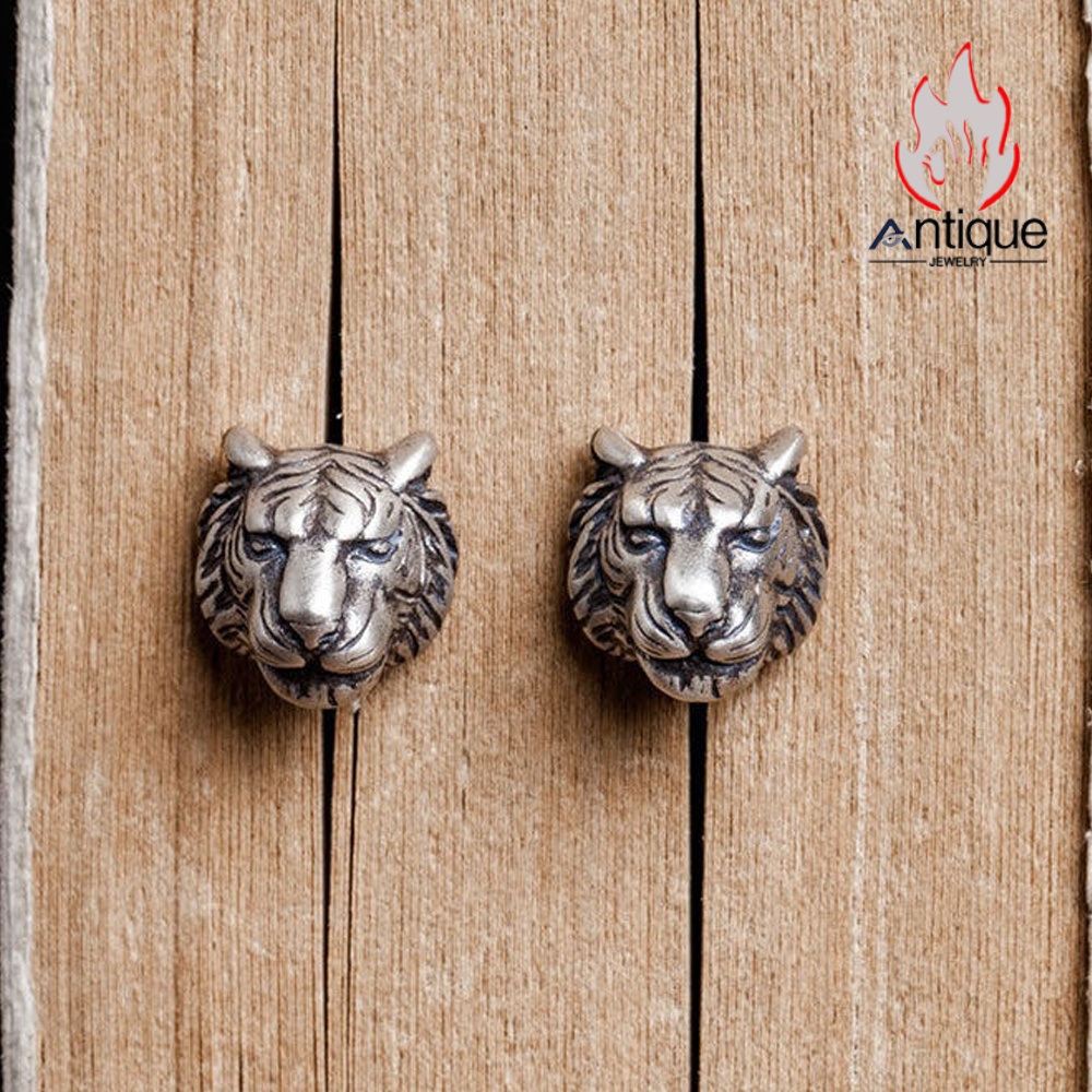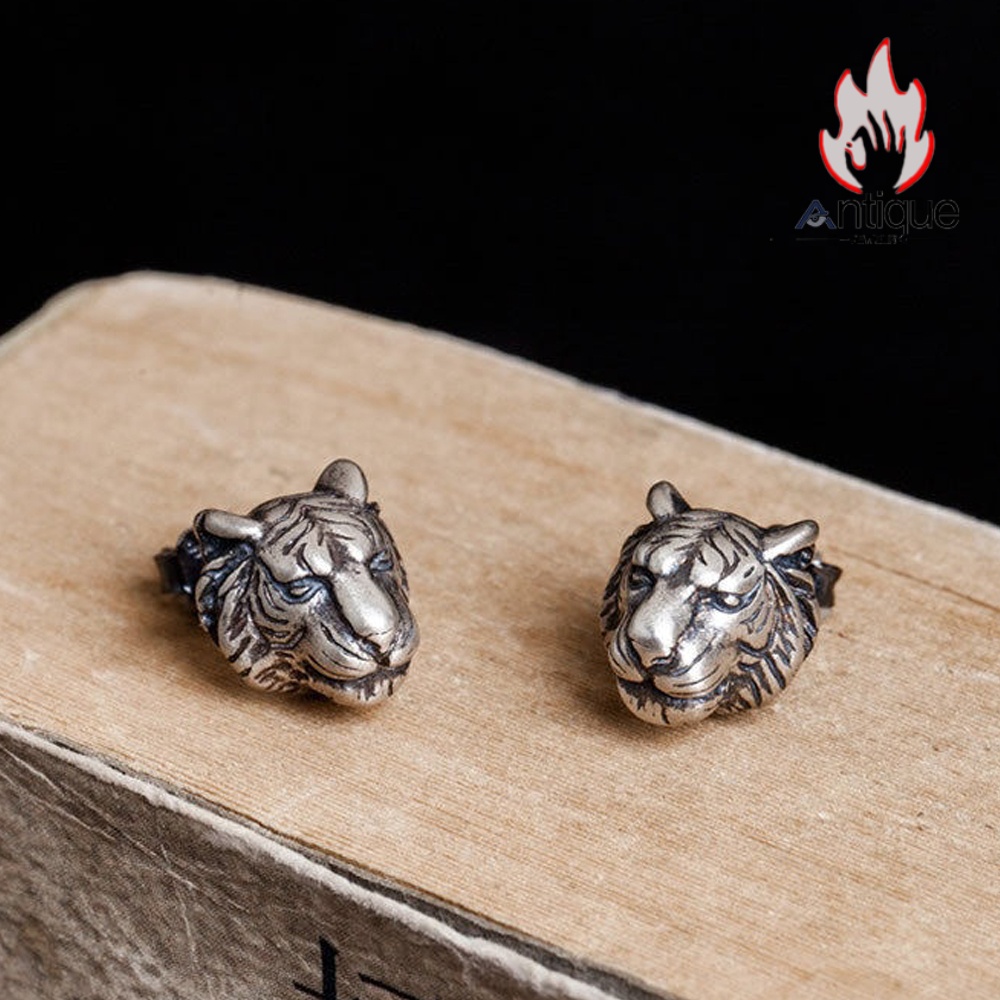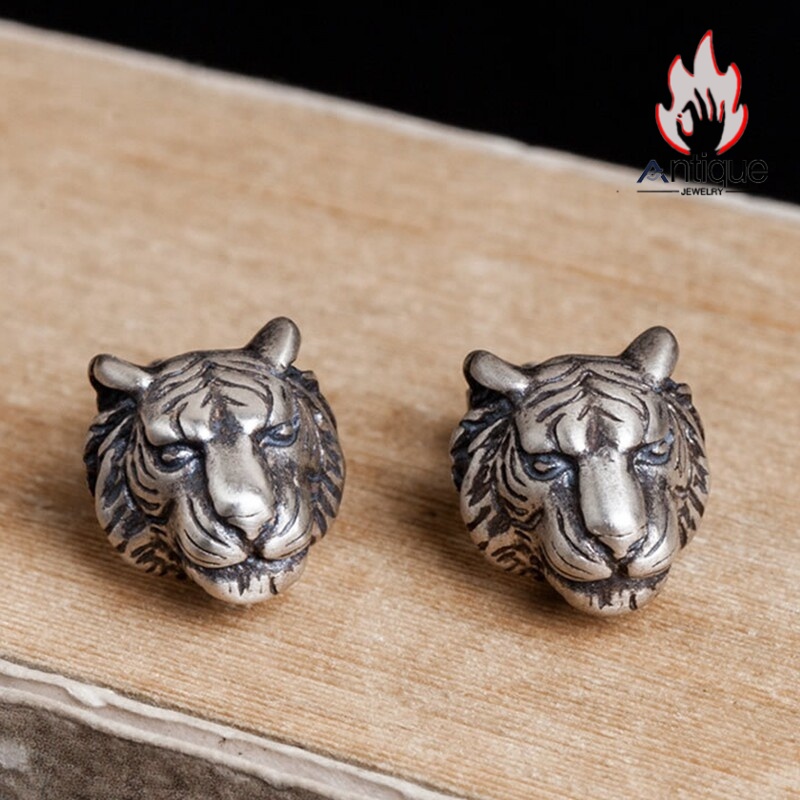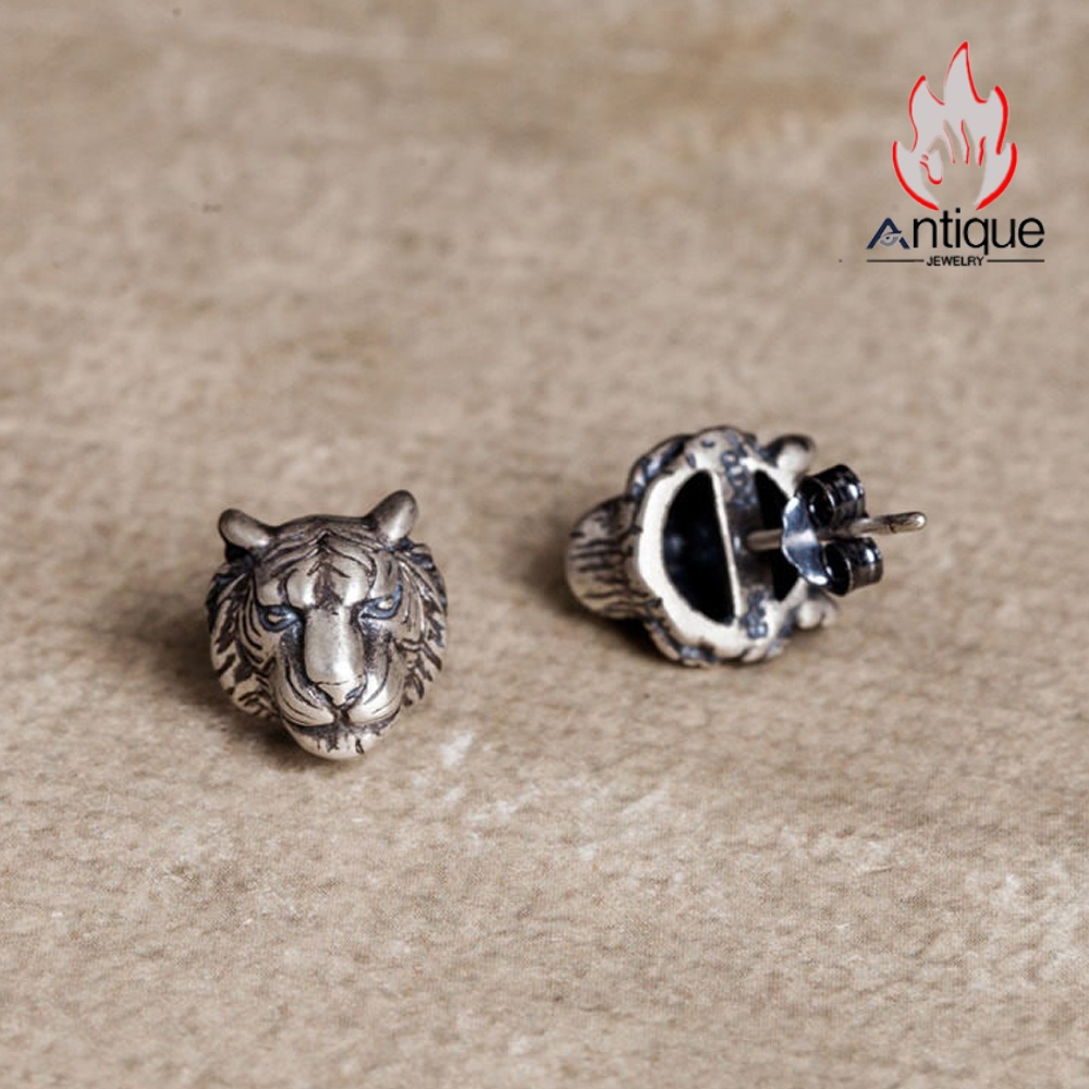 Antique Jewelry S925 シルバー レトロ 百獣の王トラデザイン メンズピアス 立体トラヘッドパンク風ピアス