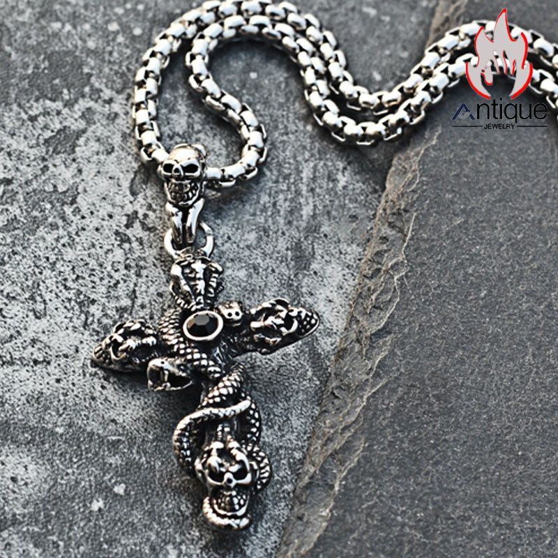 Antique Jewelry 個性的な蛇が巻きつくゴシック風骸骨十字架ペンダント メンズ タングステンスチールのネックレス ゴシックファッションアクセサリー