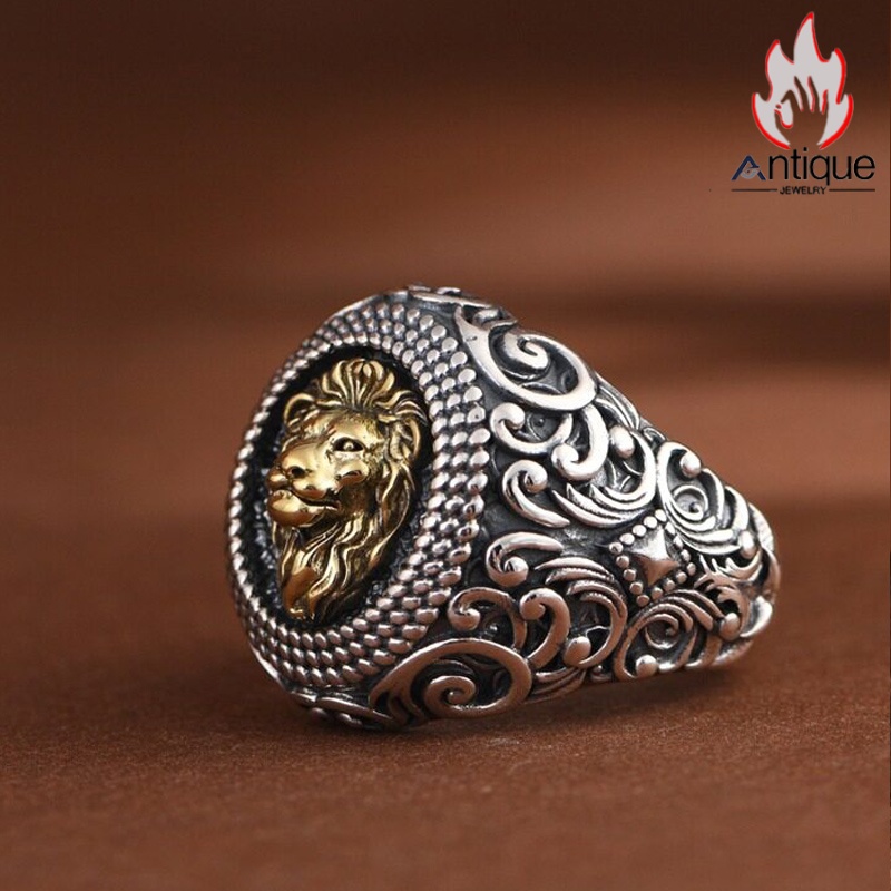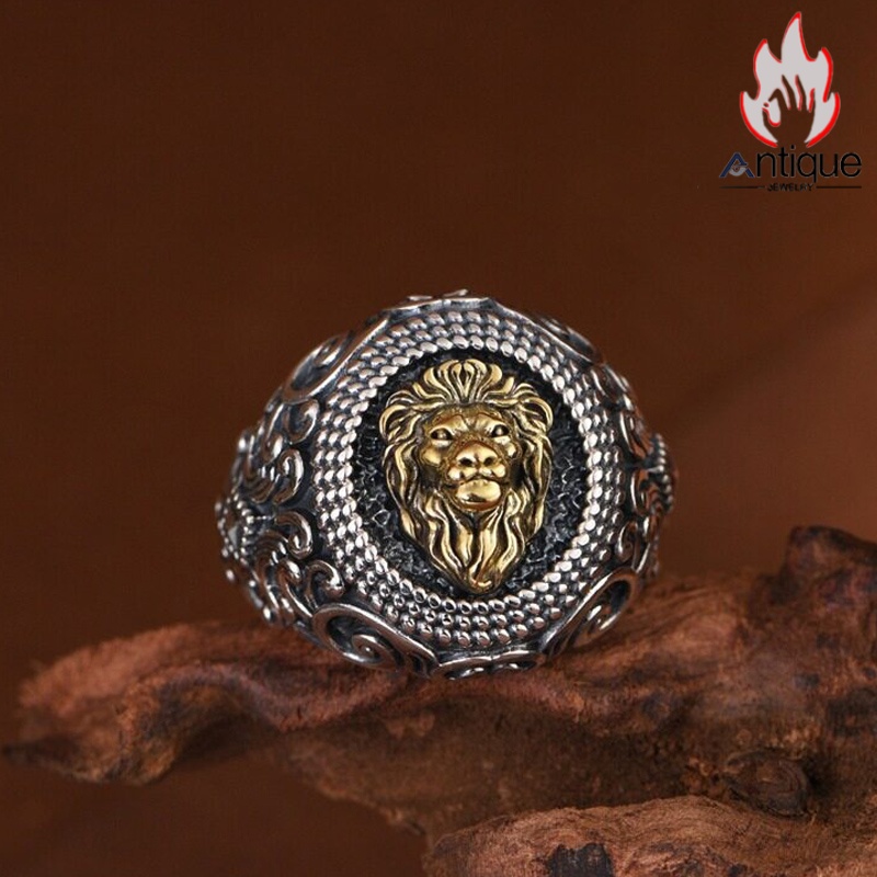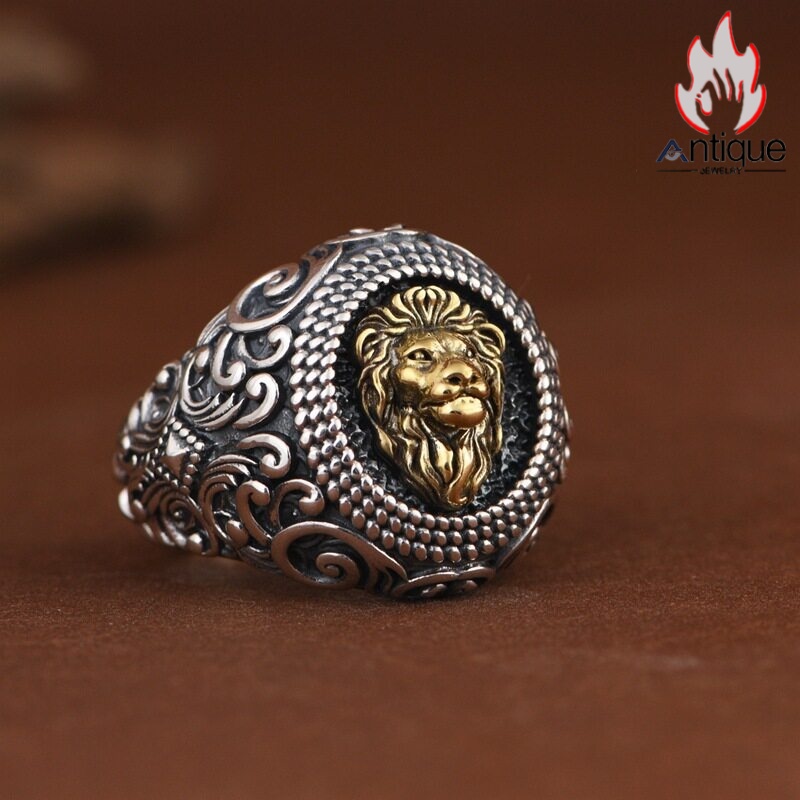 Antique Jewelry S925 シルバー ゴールドライオンヘッドリング 唐草模様 メンズ ヴィンテージゴシック調 ライオンリング