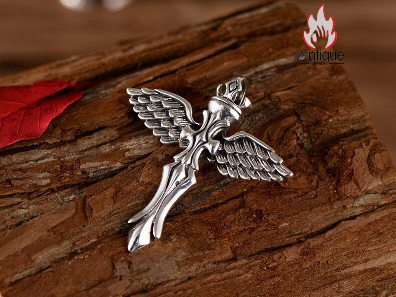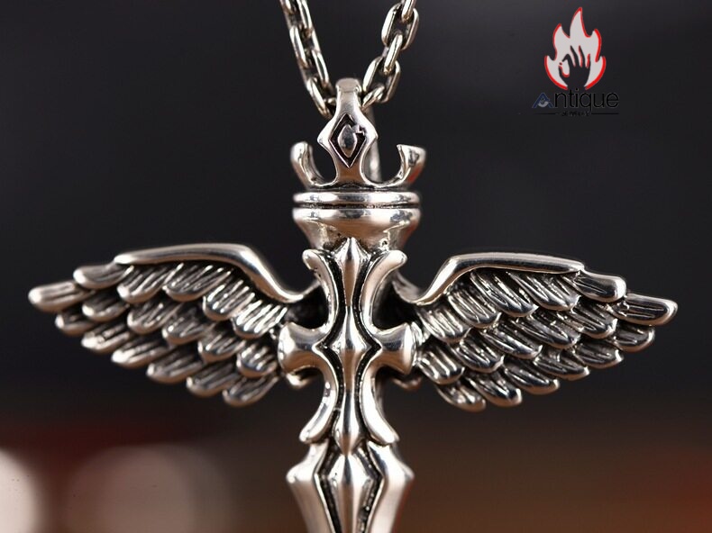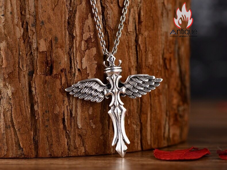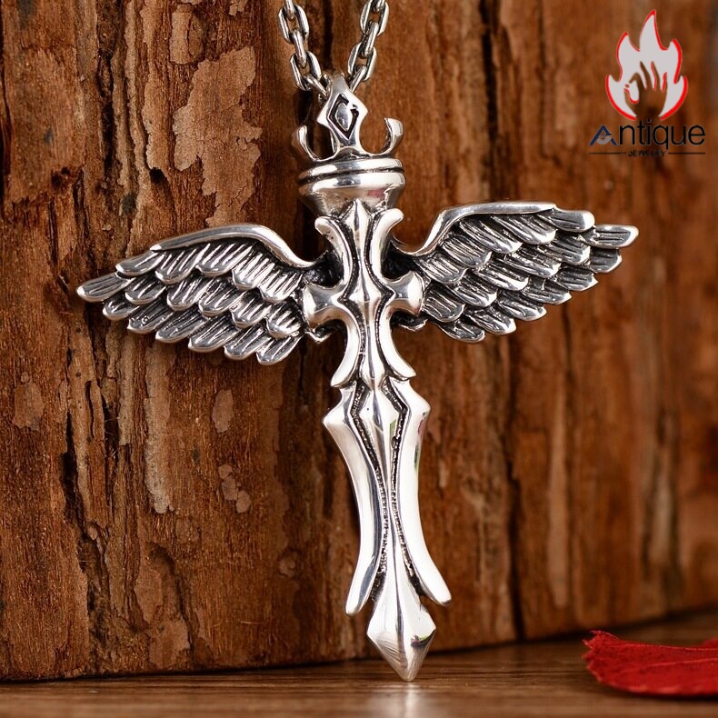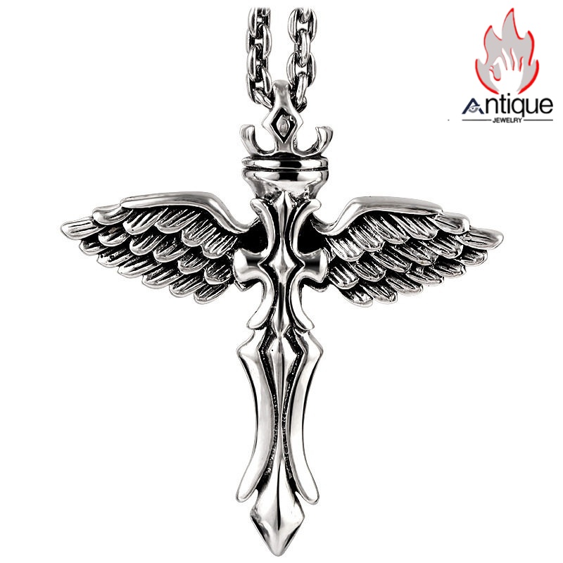 Antique Jewelry S925 シルバー エンジェルウィング クロス クラウンデザイン 個性的ヴィンテージ ユニセックスペンダントネックレス