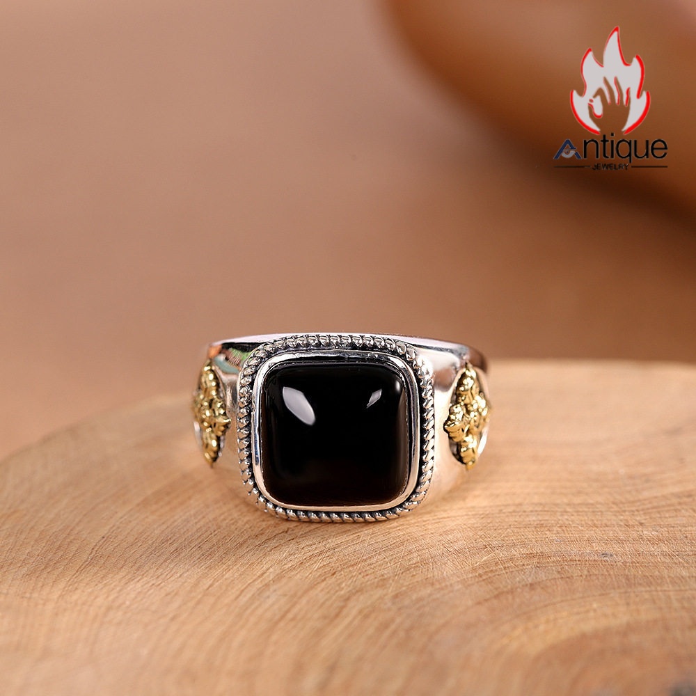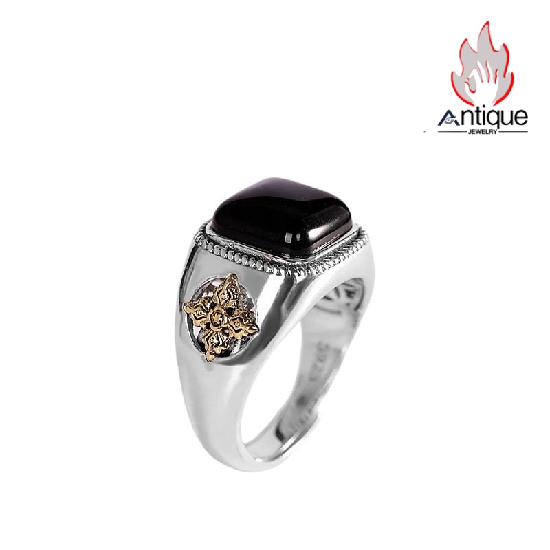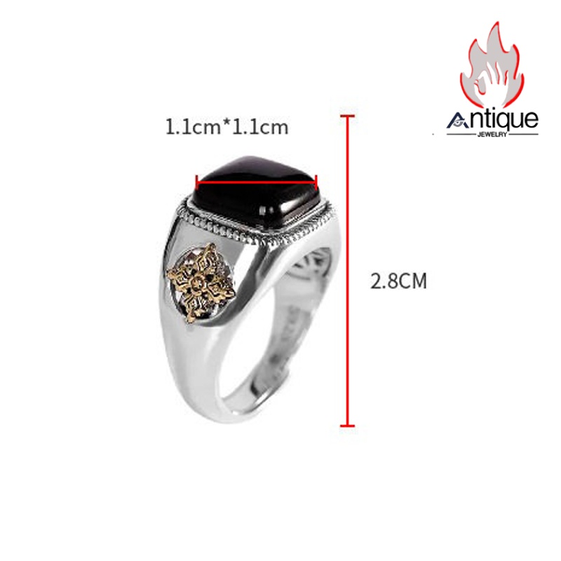 Antique Jewelry S925 シルバー 精巧な金剛杵・降魔デザイン メンズオープンリング 黒オニキスリング サイズ調整可