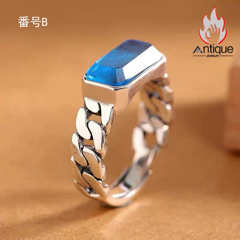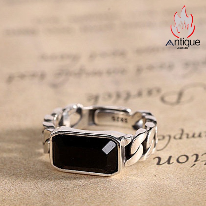 Antique Jewelry S925 純銀 メンズリング 編み込みデザイン 光沢スクエア ブラックオニキス サファイア レトロシンプル 指輪 アクセサリー