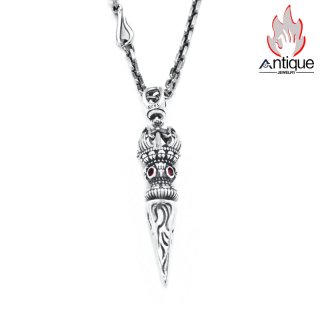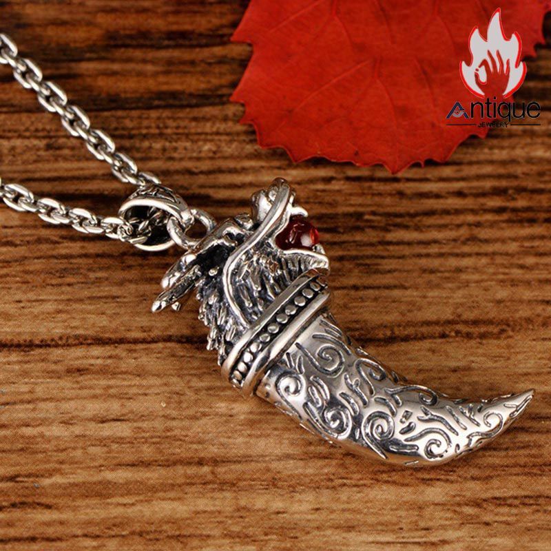 Antique Jewelry 石榴石入り龍吊りペンダント - 大人気の925銀メンズ用アクセサリー、古風でお洒落、龍の牙をモチーフに高貴な雰囲気