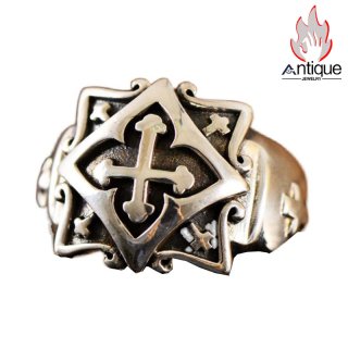 Antique Jewelry S999シルバーアクセサリー - クロスと文字が彫られた、ヴィンテージ感漂うパンクテイストのメンズオープンデザインリング