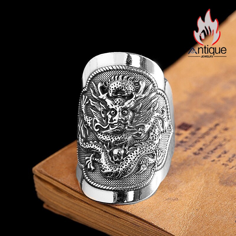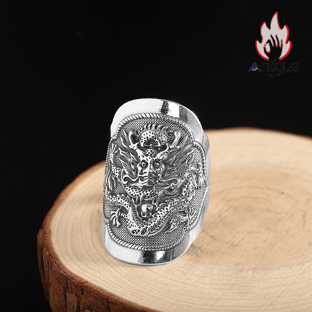 Antique Jewelry S999 シルバー 精巧なドラゴンデザインリング 竜図案ワイドバンド メンズ ヴィンテージ個性的