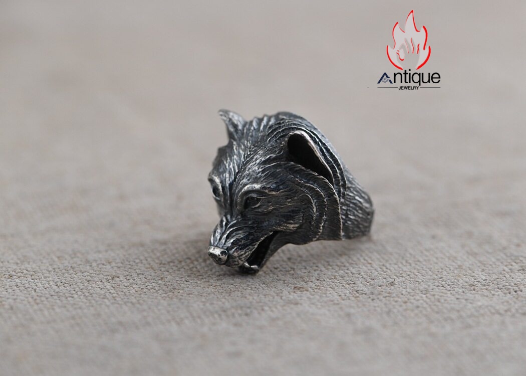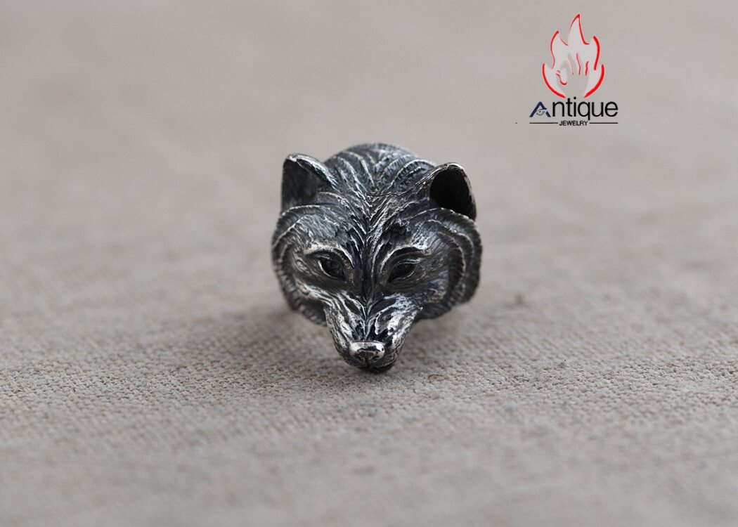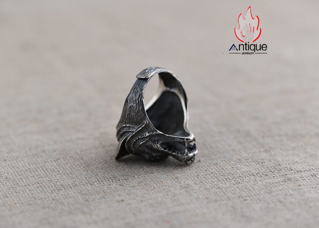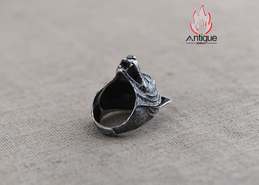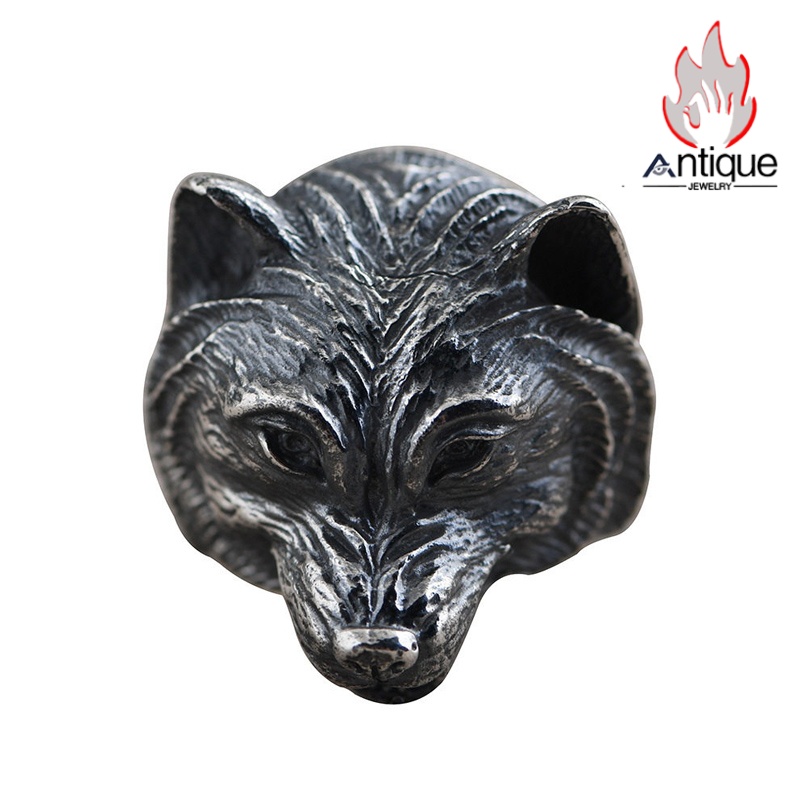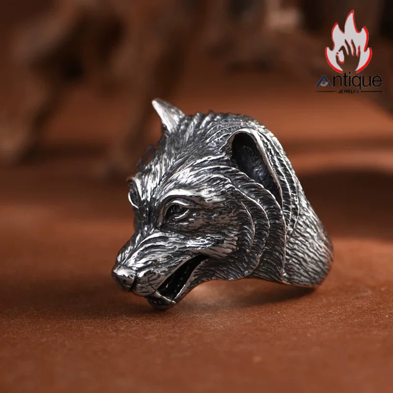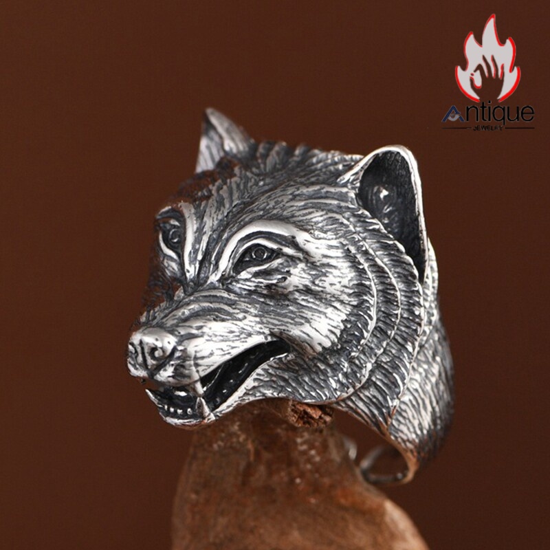Antique Jewelry S925 純銀 ウルフトーテム 精密彫刻デザイン オオカミ顔モチーフ メンズリング 個性存在感ある指輪アクセサリー