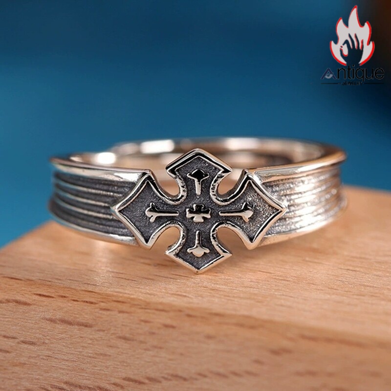 Antique Jewelry S925 シルバー 精密仕上げ クルセイダークロスリング ユニセックスオープンリング パンク風