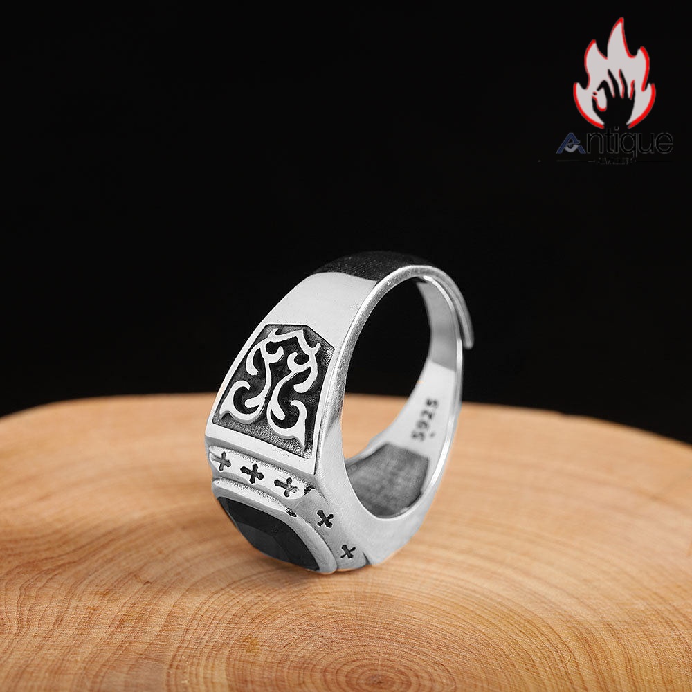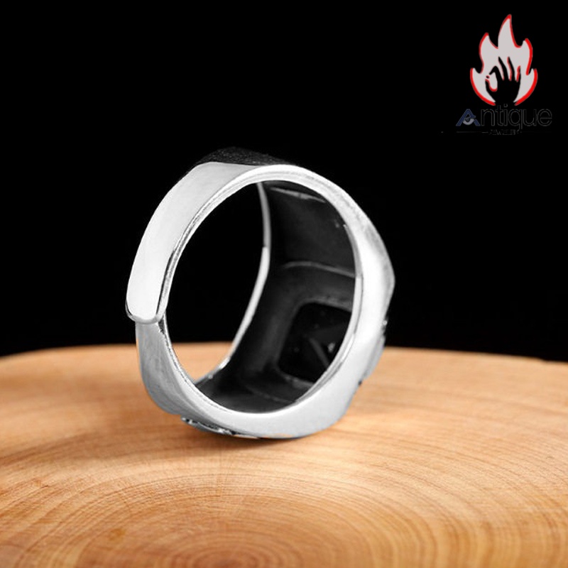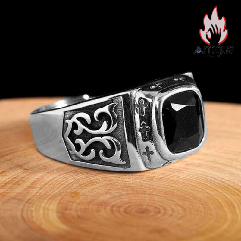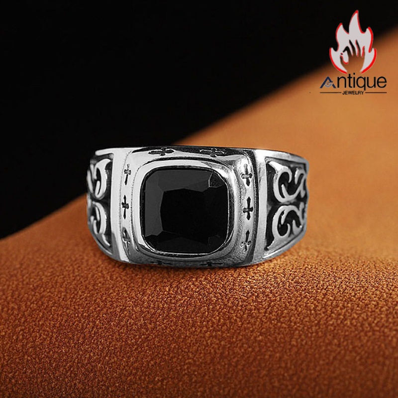 Antique Jewelry S925 純銀 メンズリング クロス ブラックオニキス 古木蔦模様 レトロおしゃれ オープンアジャスタブル ペア シンプルデザイン 指輪アクセサリー