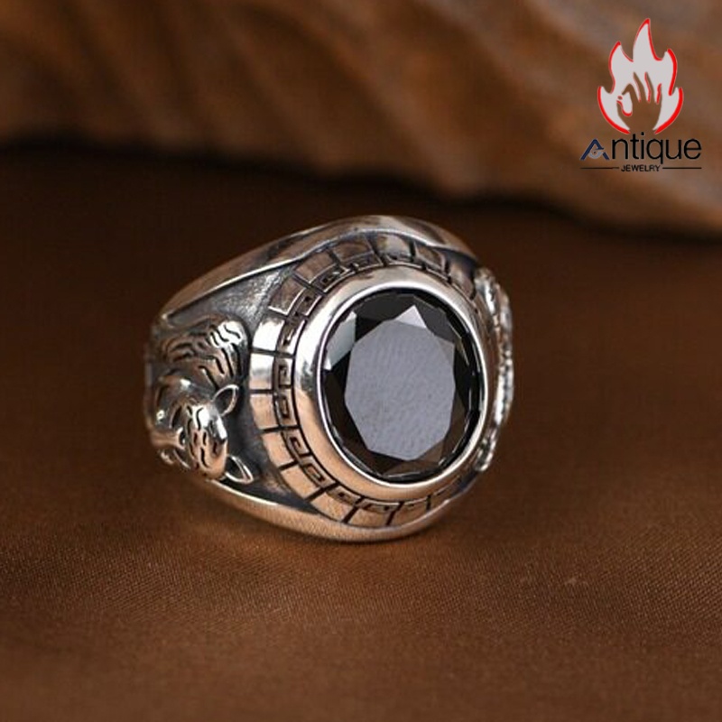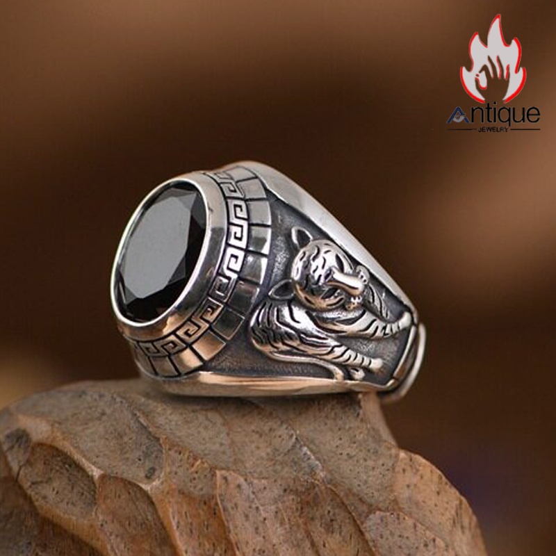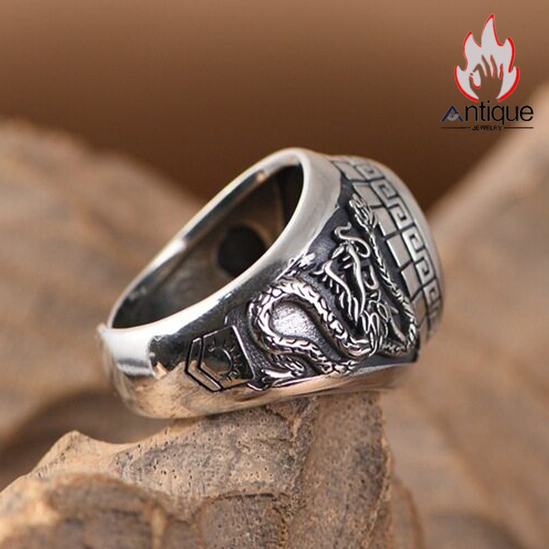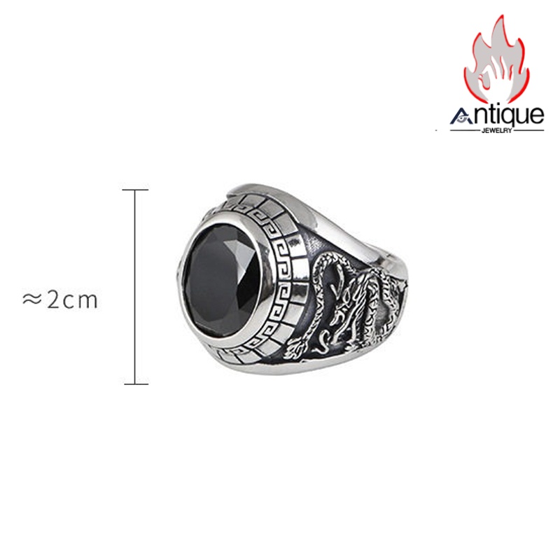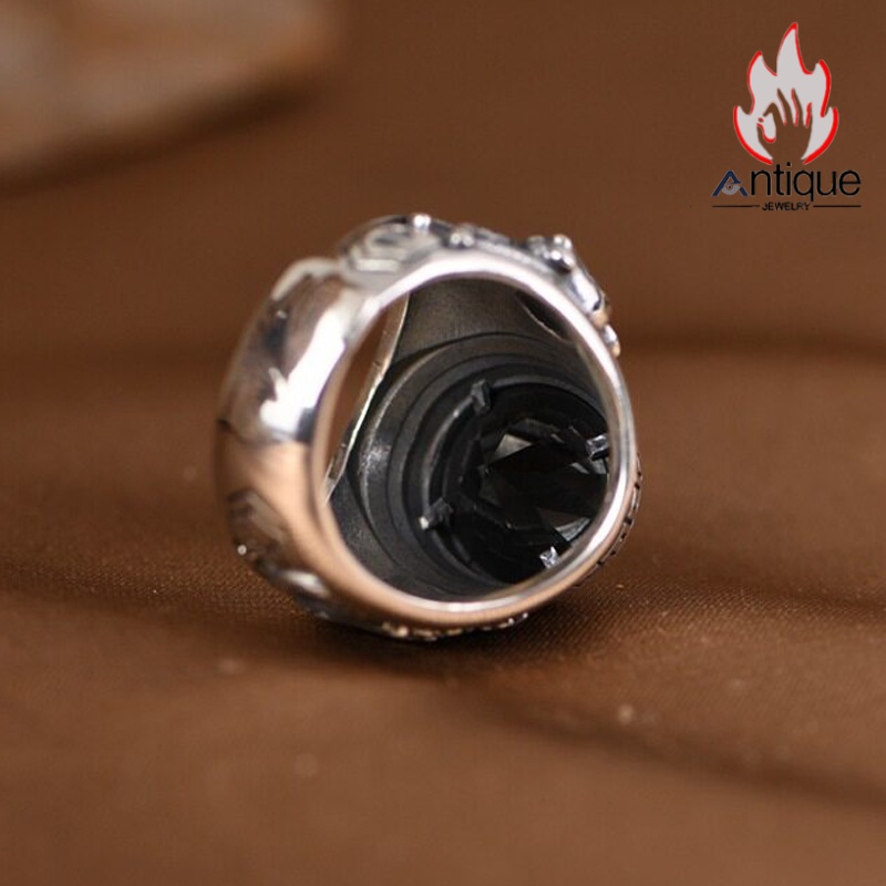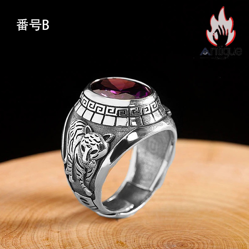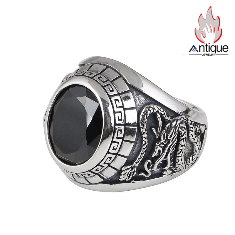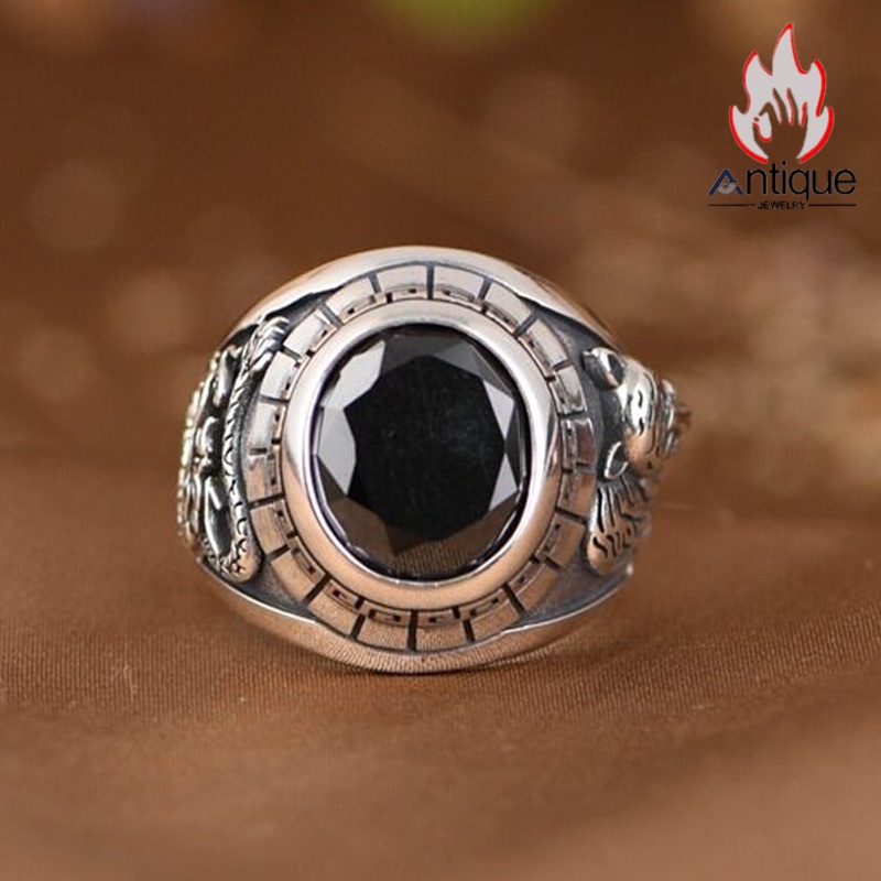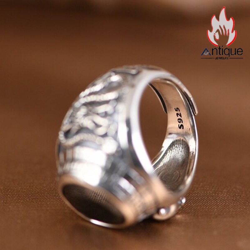 Antique Jewelry S925 純銀 青龍 白虎 四神獣モチーフ ブラックオニキス メンズオープンリング シンプル重厚感 ファッション個性デザイン 指輪アクセサリー
