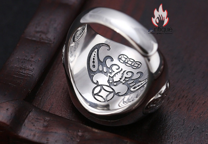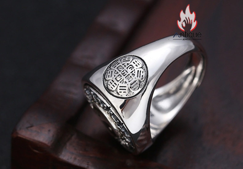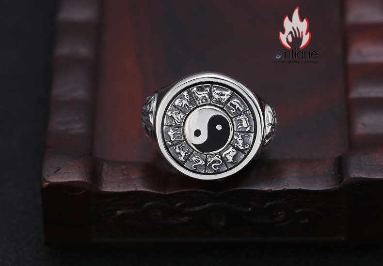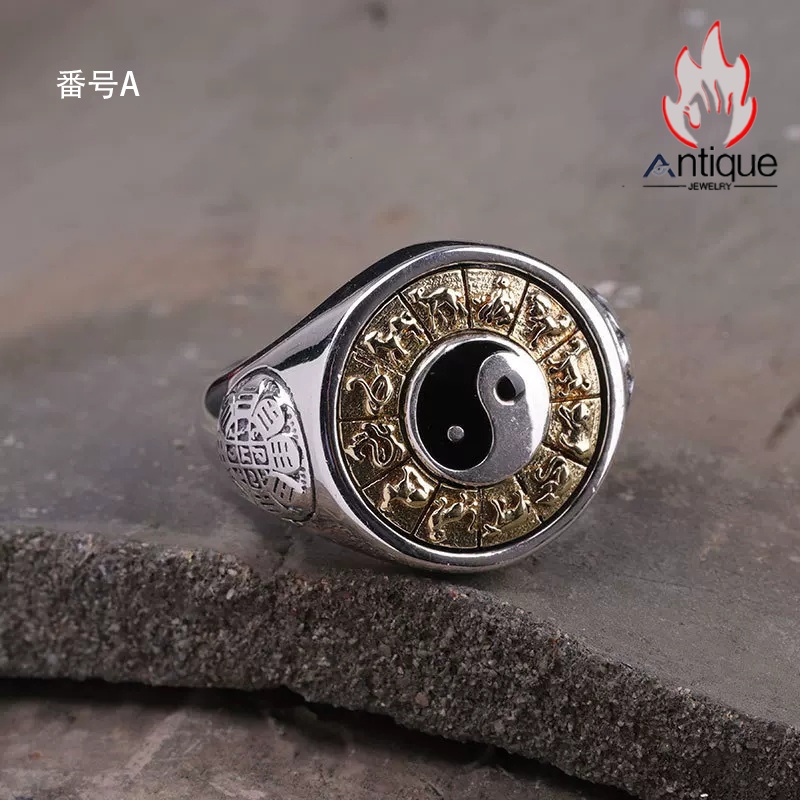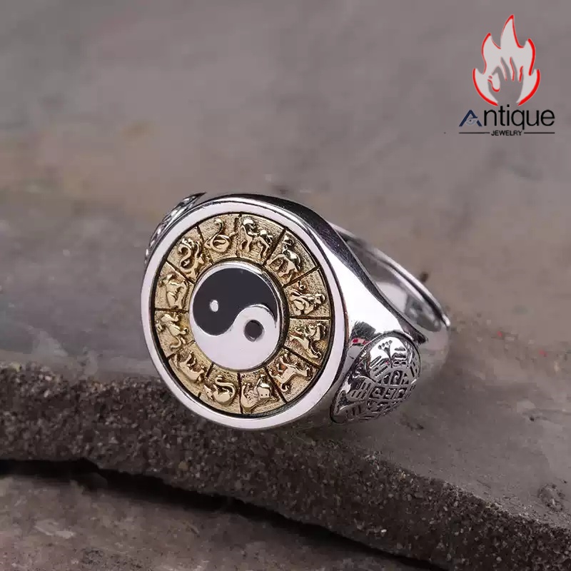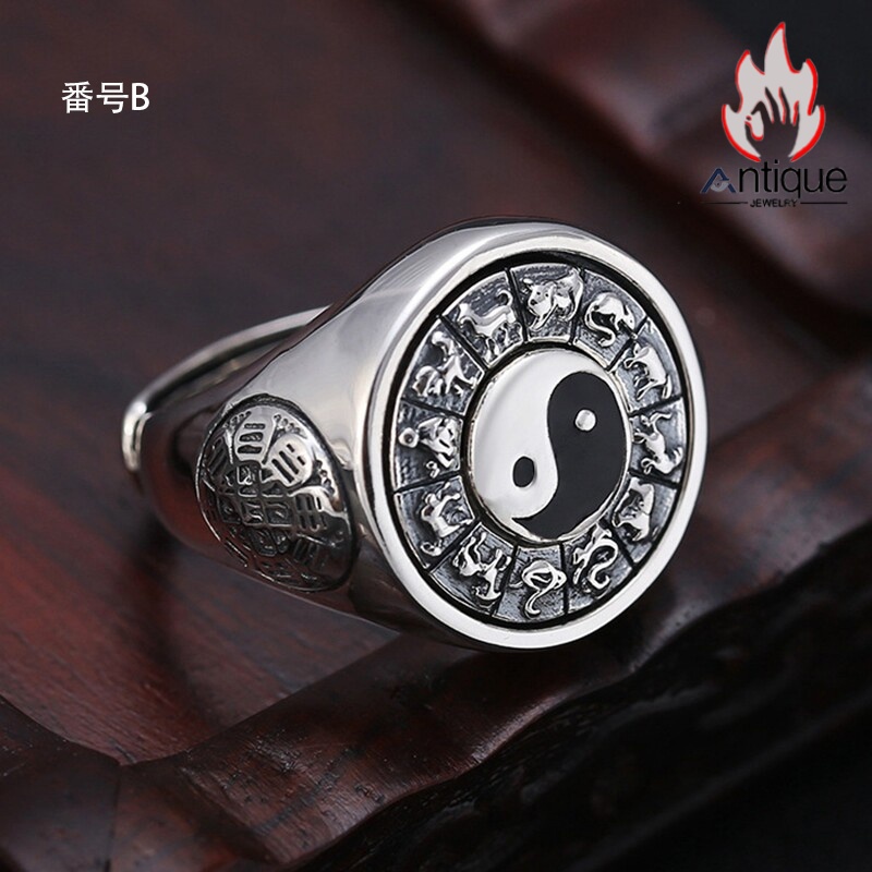Antique Jewelry S925 シルバー 太極図 八卦紋 九宮配置 十二支動物モチーフ インデックスリング メンズ 伝統和風 個性存在感抜群 風水アクセサリー