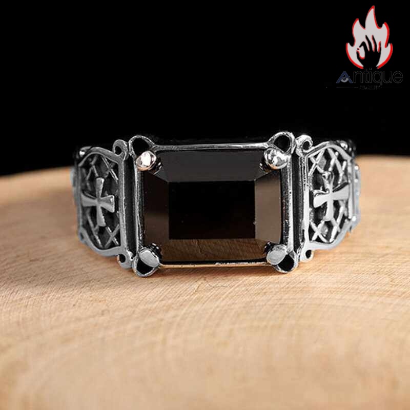 Antique Jewelry S925 シルバー クロスリング メンズ ヒップホップ調 黒オニキス 個性的ヴィンテージリング