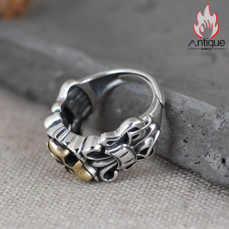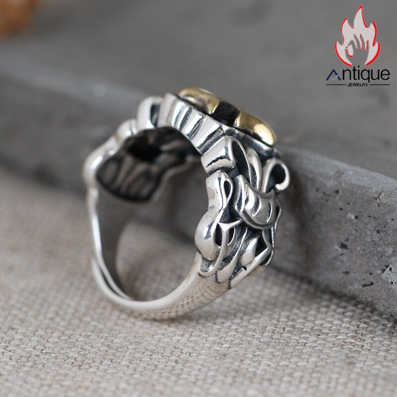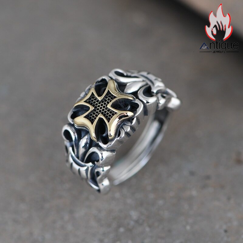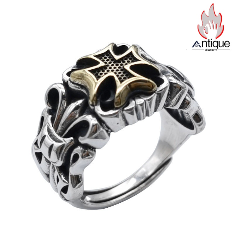 Antique Jewelry S925 シルバーアクセサリー 十字薔薇 × ゴールドクロス ゴシック オープンバンド メンズリング