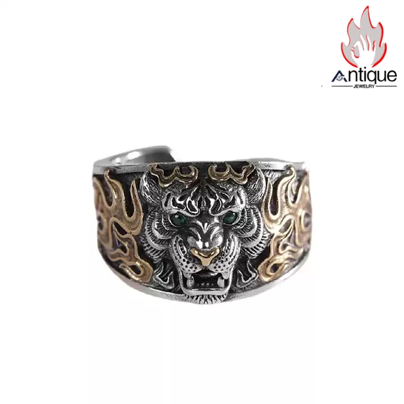 Antique Jewelry S925 シルバー 精密仕上げ 百獣の王タイガーデザインリング ゴールド焔柄 メンズタイガーヘッドリング