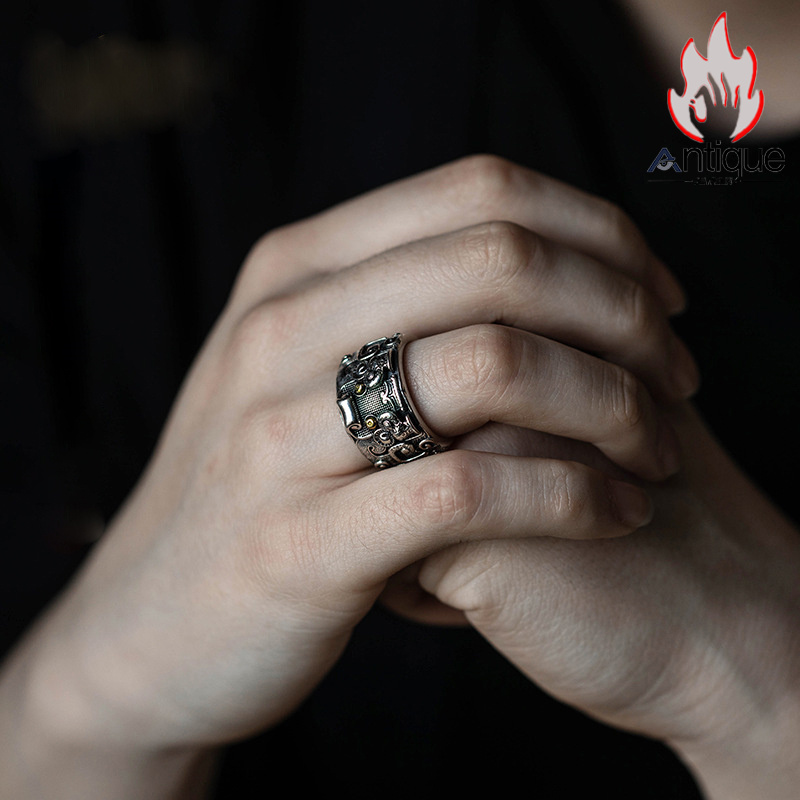 Antique Jewelry ヴィンテージシルバージュエリー 男性用饕餮紋の指輪 神獣の開口調整リング