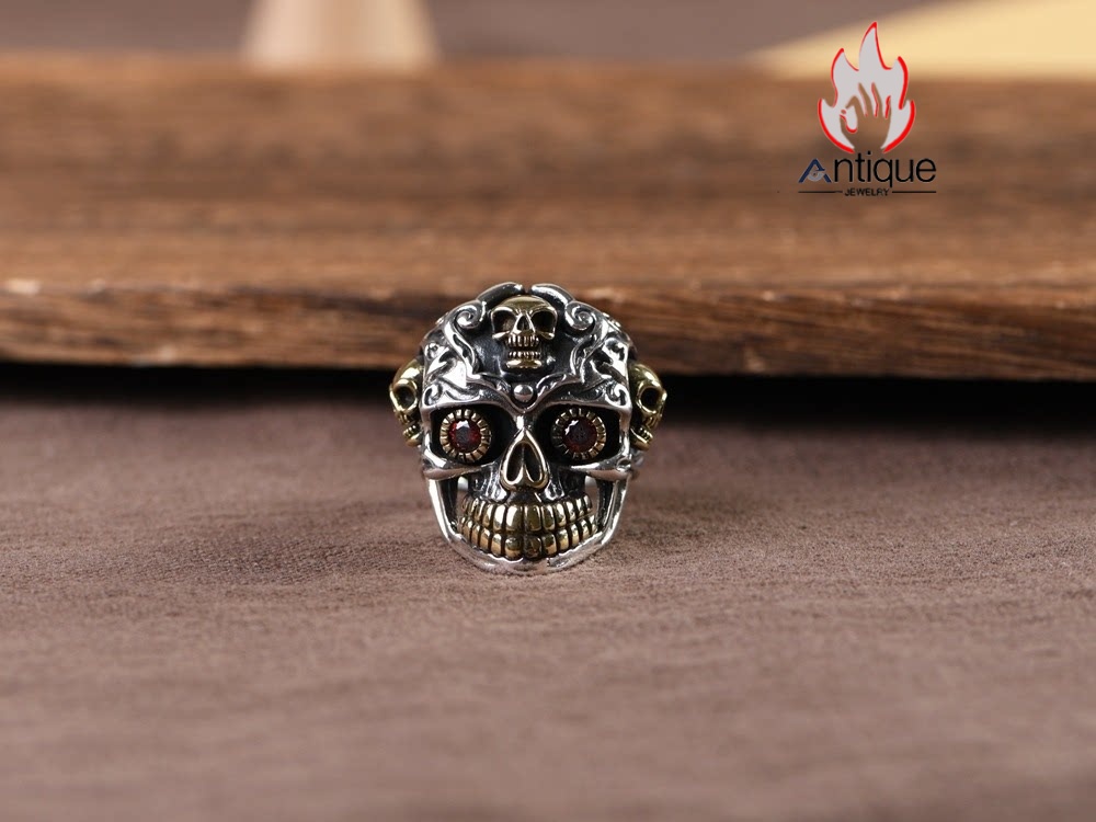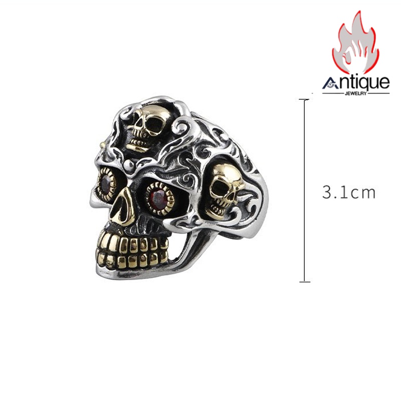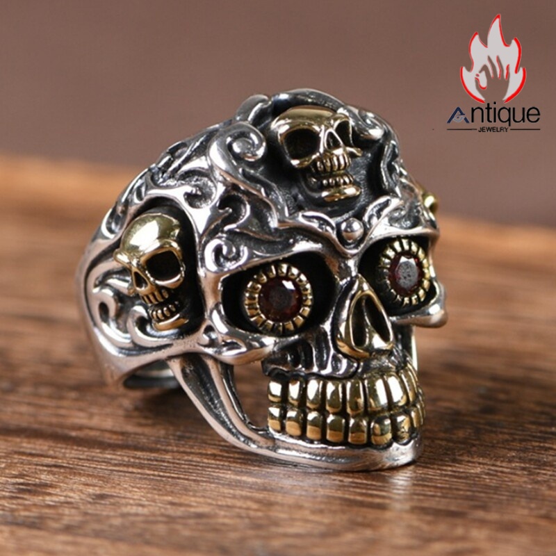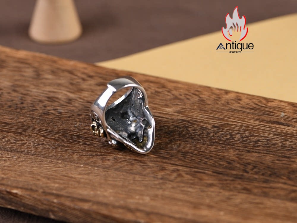 Antique Jewelry S925 純銀 髑髏 スカル パンク ゴシック メンズ 指輪 人差し指 リング オープン サイズ調整可能 ヴィンテージ アンティーク加工 レトロ 錆風デザイン