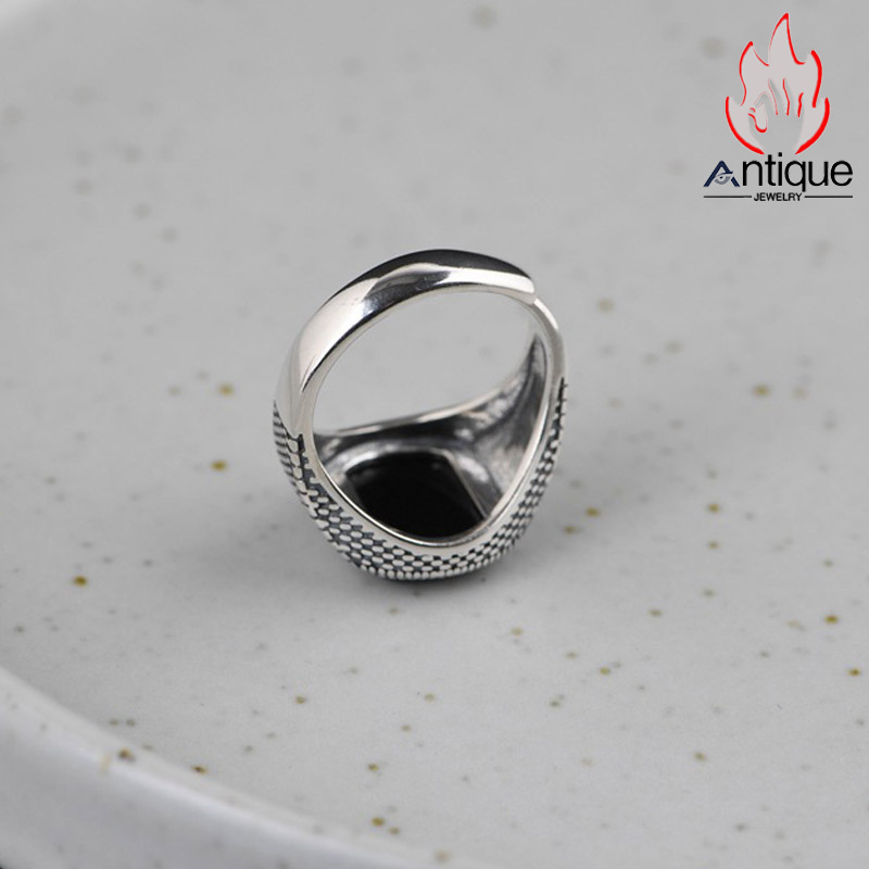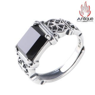 Antique Jewelry ブラックオニキスリング、S925シルバー、ビンテージスタイル、人差し指リング、シンプル&モダン、開口式シルバーリング、メンズ