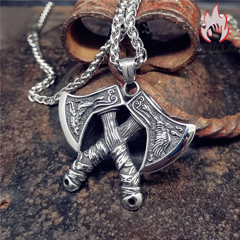 Antique Jewelry ヴィンテージ風双斧ペンダント メンズ用のチタンスチール製パンクなヴァイキングオーディンアックス個性的なネックレス に興味を持って頂きありがとうございます